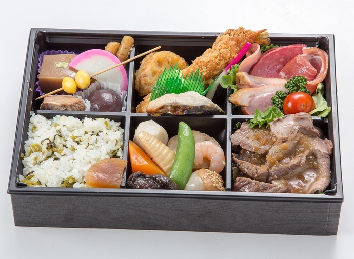 ごはん・エビフライ・焼き魚・蓮根はさみ揚げ・煮物盛り合わせ・たたき牛蒡・鴨ロース・煮豆・卵焼き・さつま芋の甘露煮・さつま揚げ・サラダ・フルーツなど。